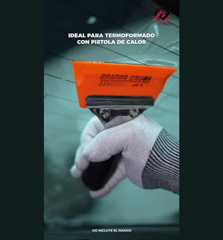 La Fusion Orange Crush Cropped 5” Angled, conocida como cola de pescado, es una espátula profesional diseñada para instaladores de polarizado que requieren precisión, control y resistencia al calor durante el trabajo. Su firmeza soft-medium de 92 durometer permite expulsar la solución de instalación mientras se desliza suavemente sobre la película, logrando un acabado uniforme. Ideal para instalaciones de polarizado automotriz y trabajos de termoformado con pistola de calor.Espátula Orange Crush Blade 5 Pulgadas para Polarizado